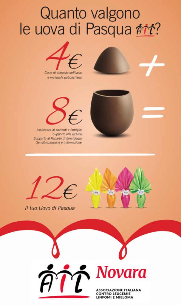 Contattaci per avere informazioni o per prenotare il tuo uovo da 350 grammi al latte o fondente con sorpresa; il contributo richiesto è di € 12 con consegna a domicilio gratuita su tutta la provincia di Novara o ritiro presso la nostra sede.