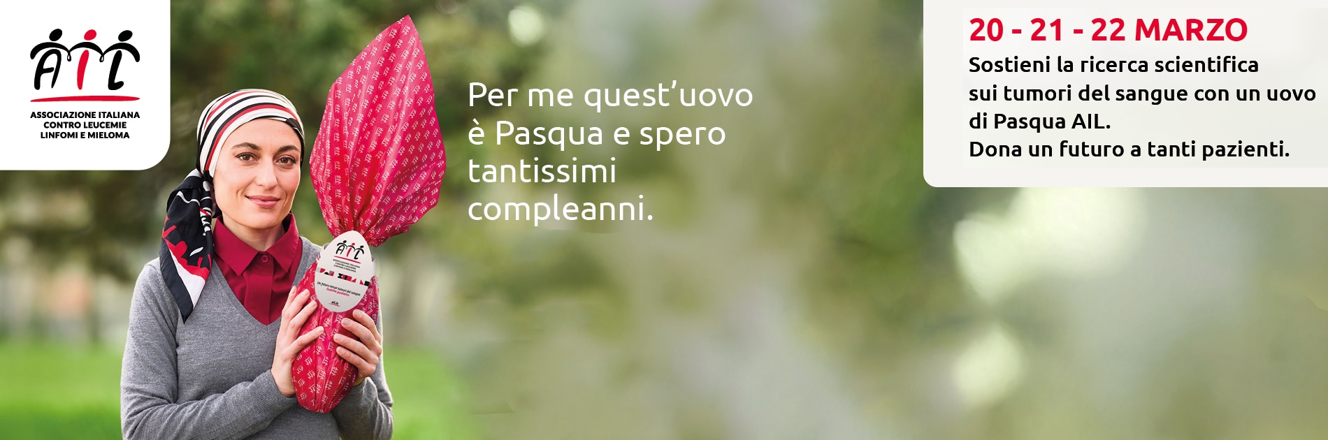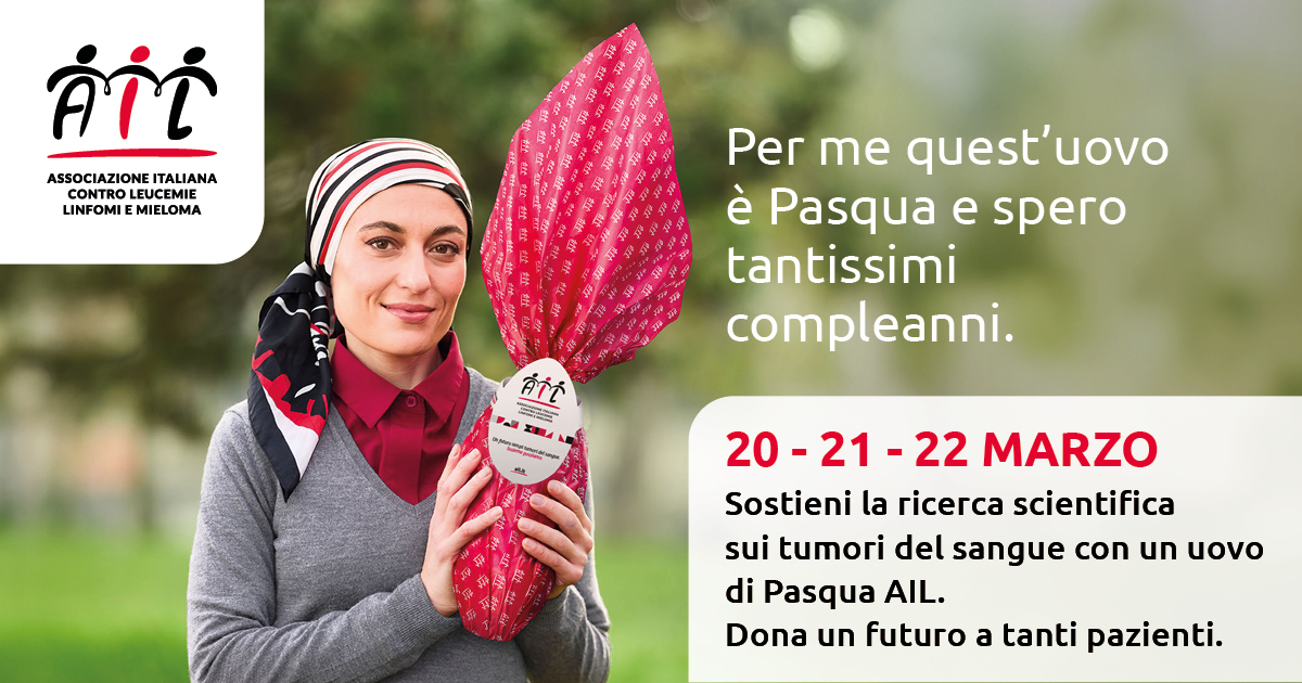 Dentro un Uovo di Pasqua AIL c’è molto di più di una semplice sorpresa. C’è il sostegno a oltre 140 studi scientifici in tutta Italia, il finanziamento di borse studio per giovani ricercatori, il supporto ai Centri Ematologici e l’assistenza migliore per i pazienti in tutta Italia. C’è la possibilità per tante persone di vivere il proprio futuro con speranza. …